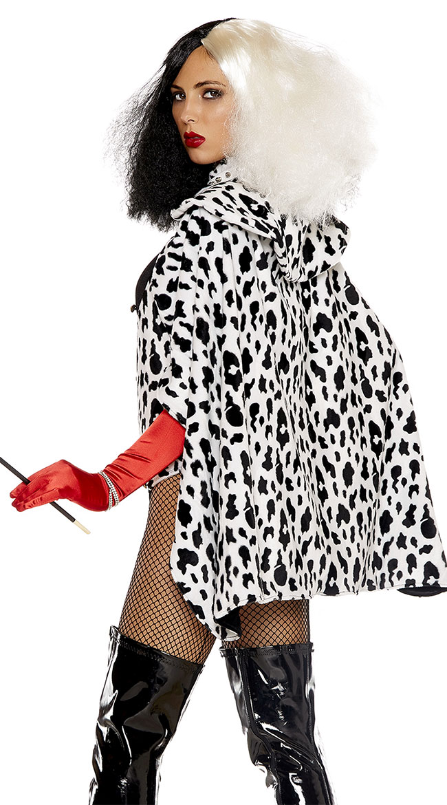 Hunt your spotted prey in this DeVilish Storybook Villain costume featuring a velvet bodysuit with a high neckline, a Dalmatian printed panel, gold button accents, a cheeky cut back, a black and Dalmatian printed cape with a gold chain, long red gloves ,and a cigarette holder. (Pantyhose and wig not included.)